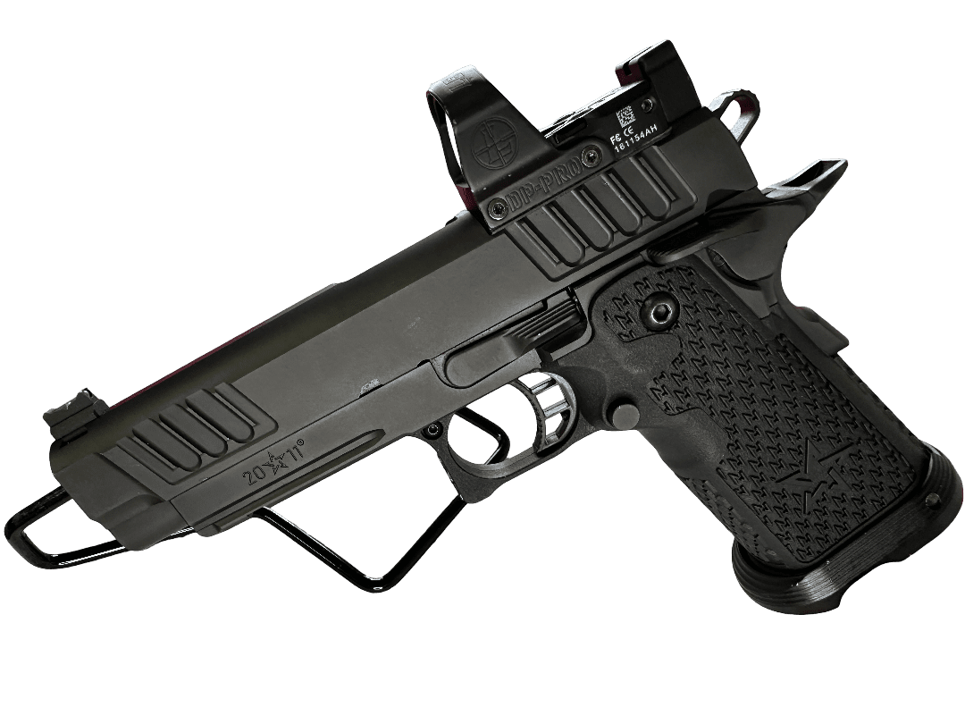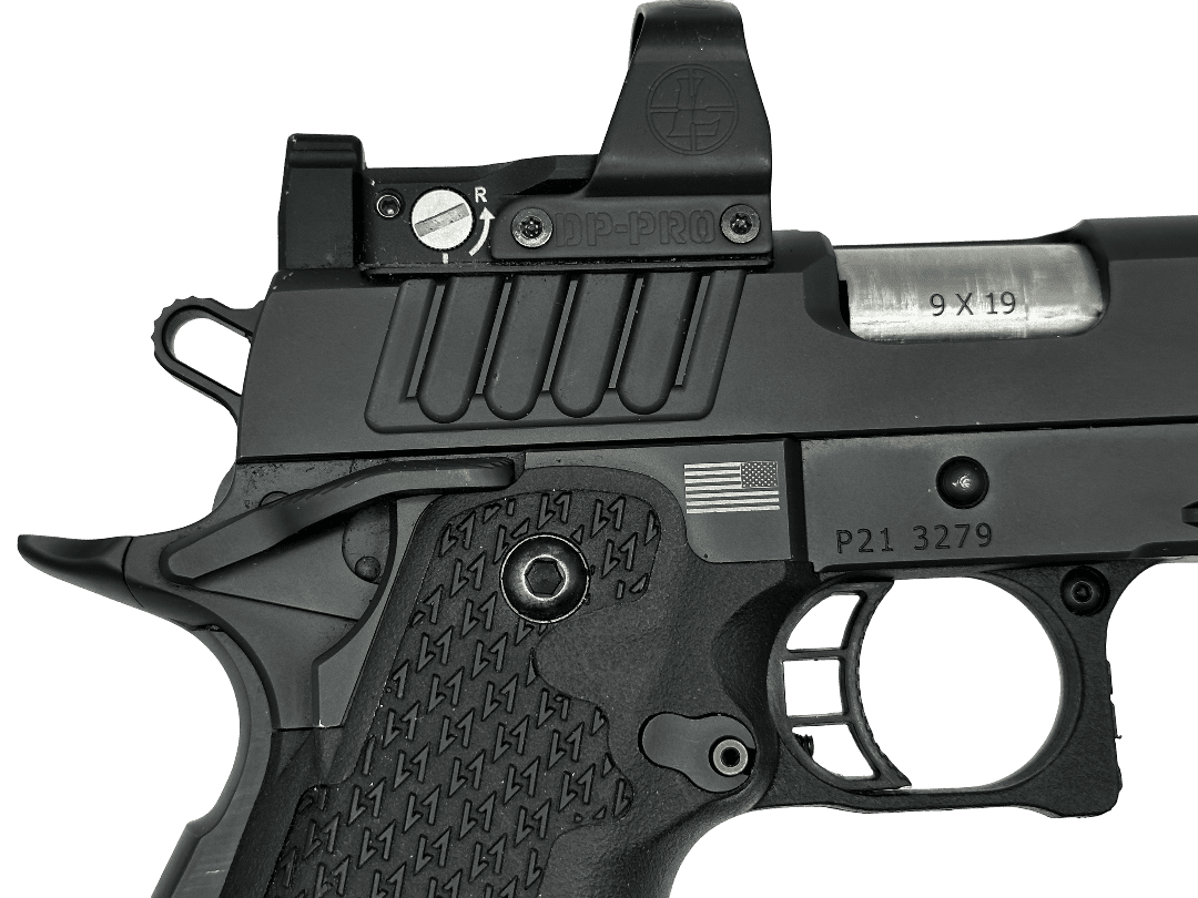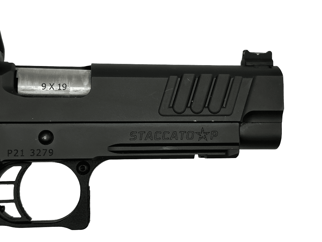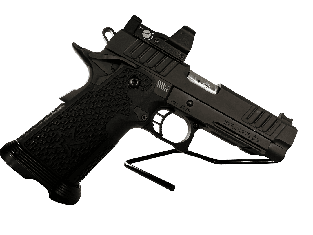 Staccato – 2011 P DPO CS Frame 9mm Luger 4.4in Black/SS Pistol Bull G2 Grip, 1-20 Rd and 5 – 17 Rd Mag w/Leupold Delta Point Pro Rear Sight – USED